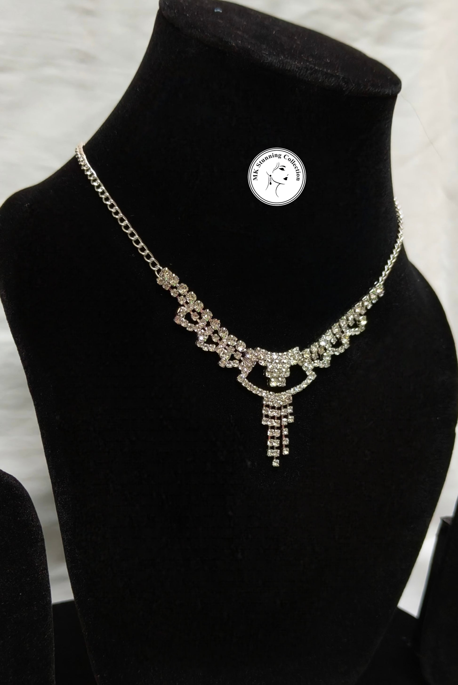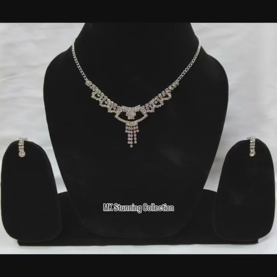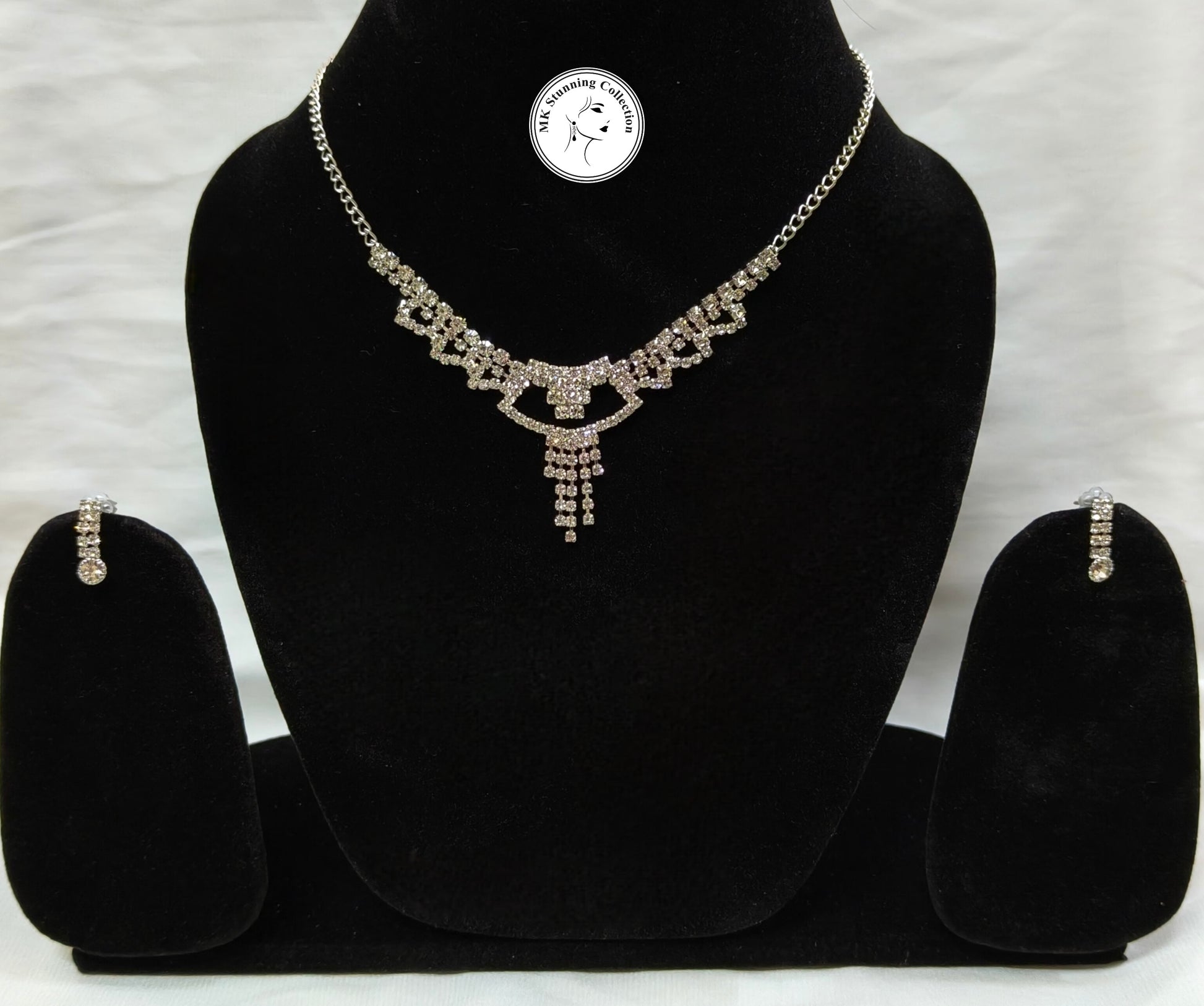 This sophisticated jewelry set features a delicately crafted silver-tone necklace adorned with shimmering crystal accents, highlighted by a graceful cascading pendant at the center. The matching earrings echo the same refined sparkle, creating a perfectly balanced and timeless look. Ideal for weddings, formal events, or evening occasions, this set adds a touch of elegance and glamour to any outfit. Designed to catch the light beautifully, it makes a stunning statement while remaining classy and refined.