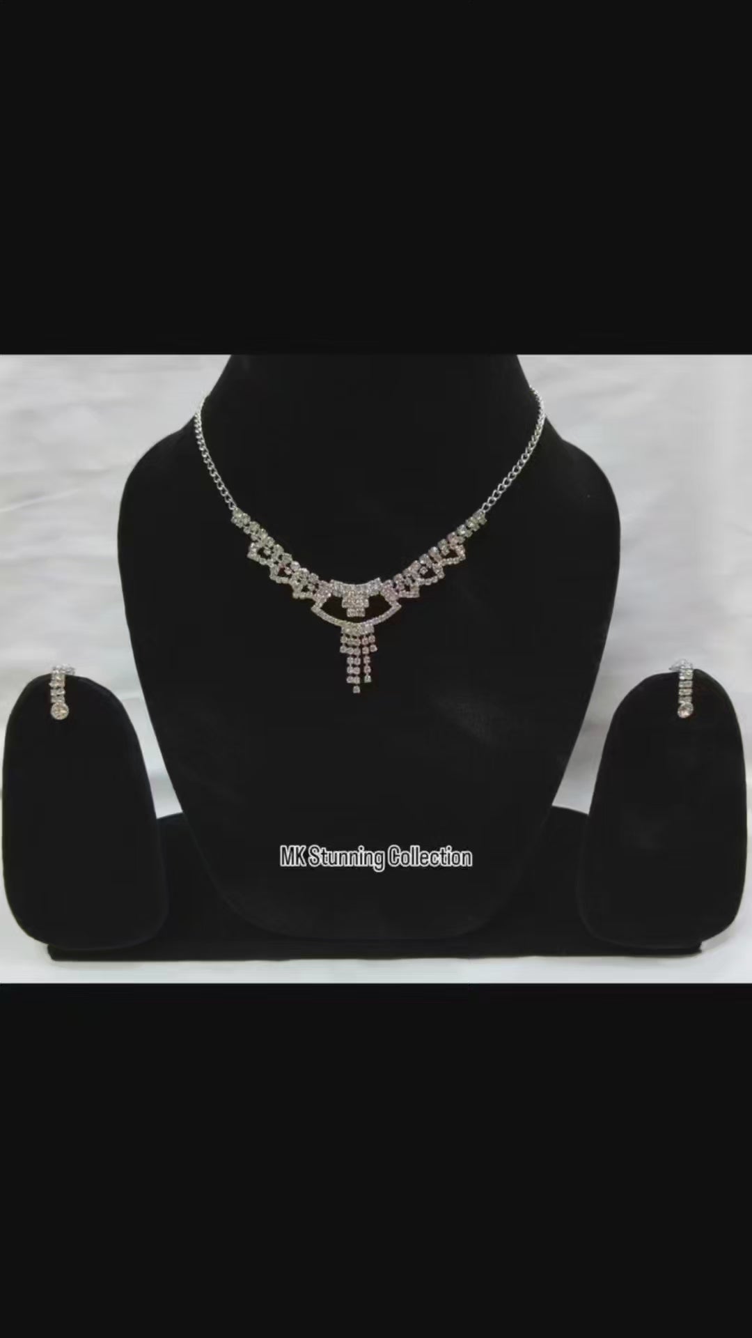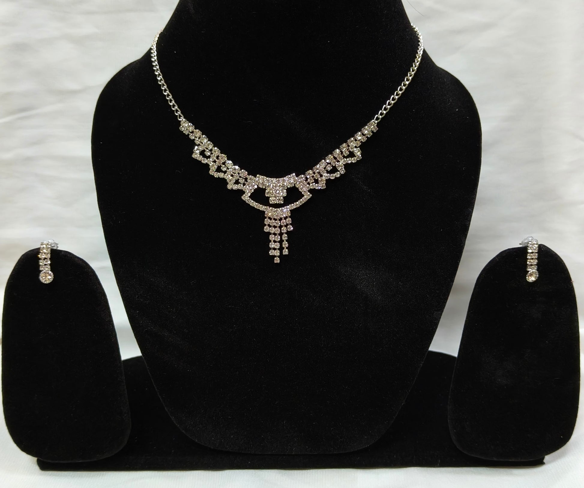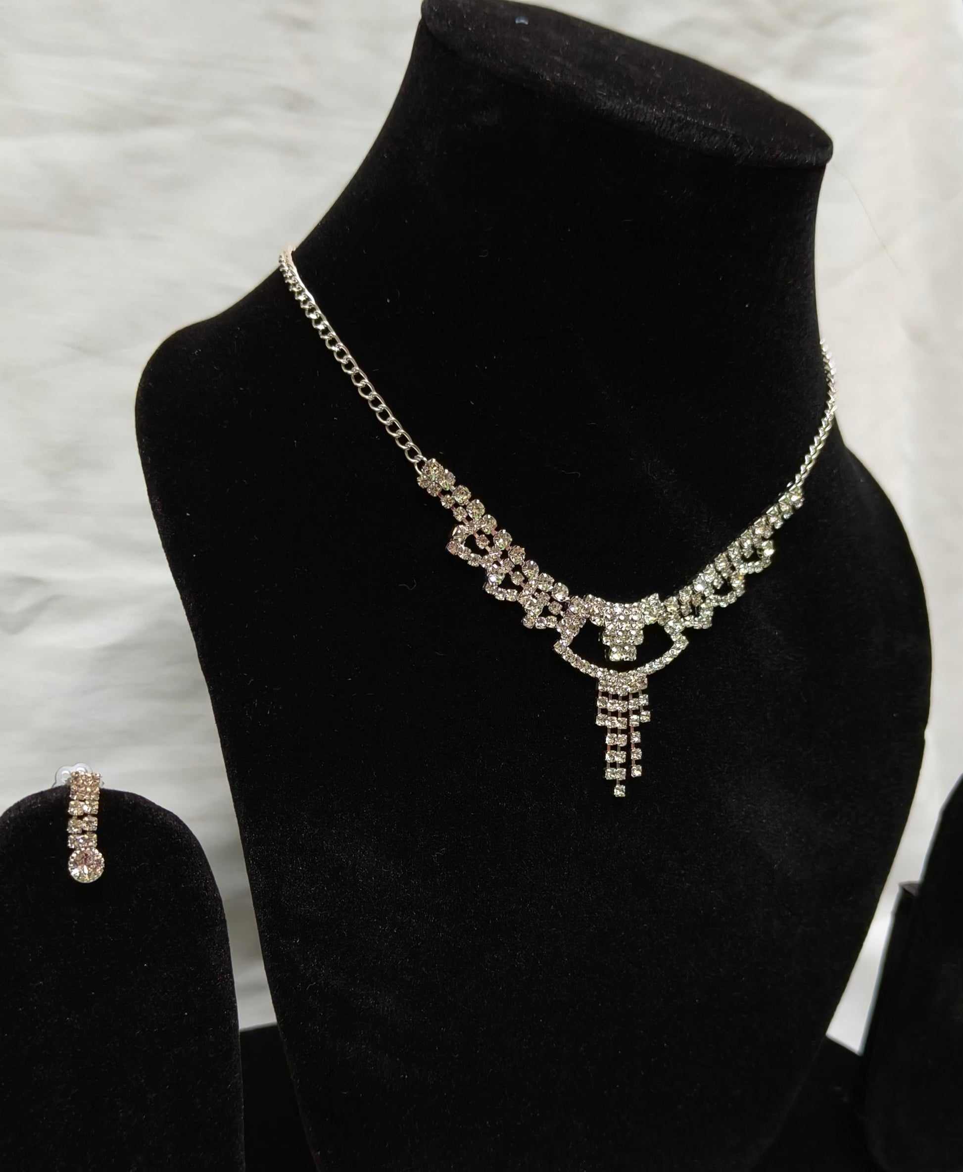 This sophisticated jewelry set features a delicately crafted silver-tone necklace adorned with shimmering crystal accents, highlighted by a graceful cascading pendant at the center. The matching earrings echo the same refined sparkle, creating a perfectly balanced and timeless look. Ideal for weddings, formal events, or evening occasions, this set adds a touch of elegance and glamour to any outfit. Designed to catch the light beautifully, it makes a stunning statement while remaining classy and refined.