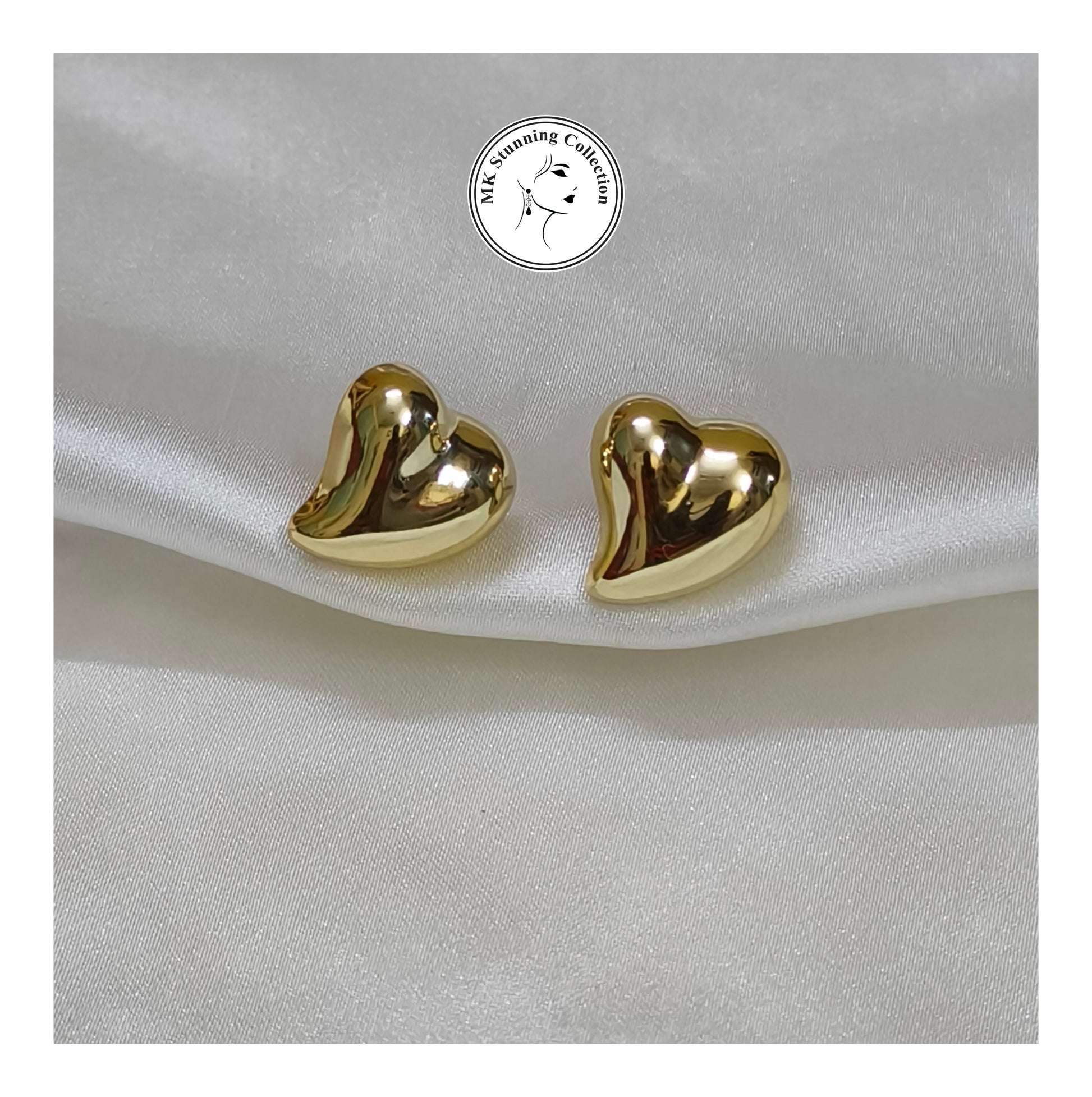 These exquisite heart-shaped stud earrings are crafted in polished gold-tone metal, radiating timeless elegance and charm. Their smooth, reflective surface and puffy design give them a modern yet romantic appeal, perfect for both everyday wear and special occasions. Displayed on a soft satin background, these earrings make a luxurious statement of love and sophistication.