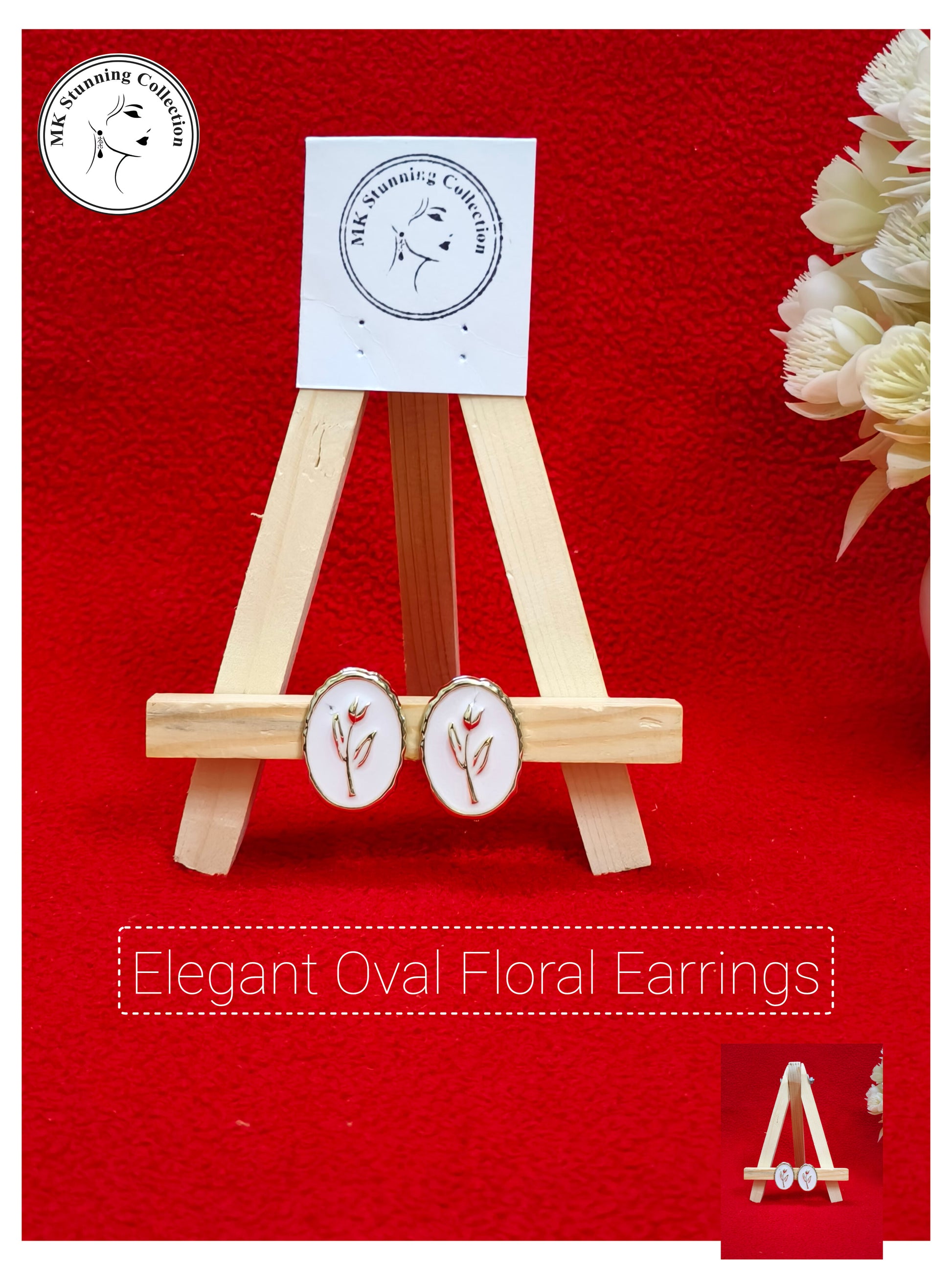 These exquisite oval-shaped earrings feature a delicate floral design, beautifully set against a smooth white background. The gold-tone metal outline adds a touch of sophistication and charm, making them perfect for both casual and formal wear. Their minimal yet elegant style captures the essence of nature with a single blooming flower, symbolizing grace and femininity. Ideal for gifting or adding a subtle accent to your ensemble.