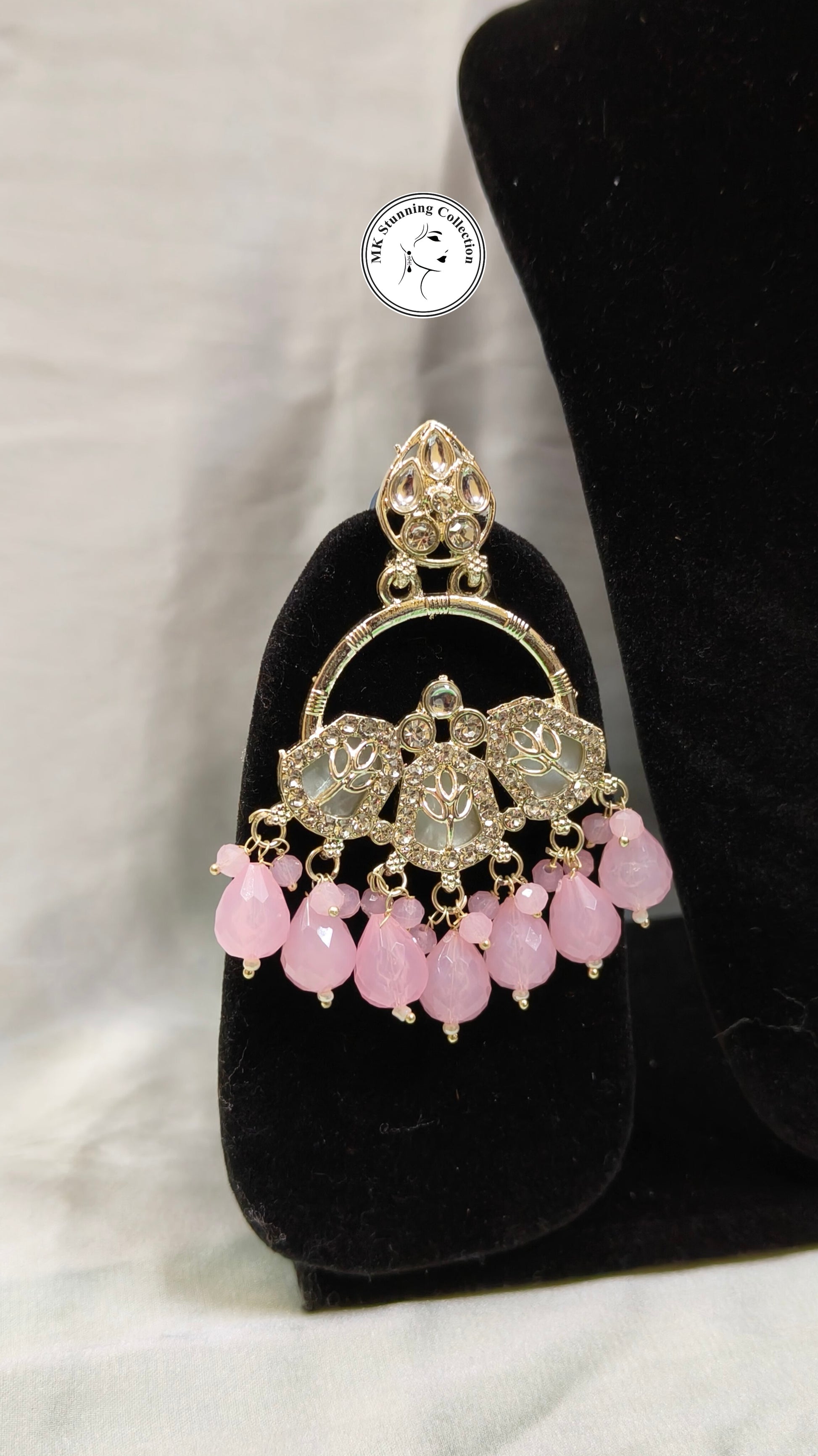 This exquisite pair of chandelier earrings features an ornate gold-tone frame adorned with delicate floral motifs and clear rhinestone embellishments. Dangling gracefully from the bottom are soft pink teardrop beads, adding a touch of feminine charm and elegance. Perfect for festive occasions, weddings, or traditional attire, these earrings strike a balance between classic design and contemporary flair. Displayed on a black earring stand with a rich red and white fabric backdrop, the intricate craftsmanship and vibrant colors truly stand out.
