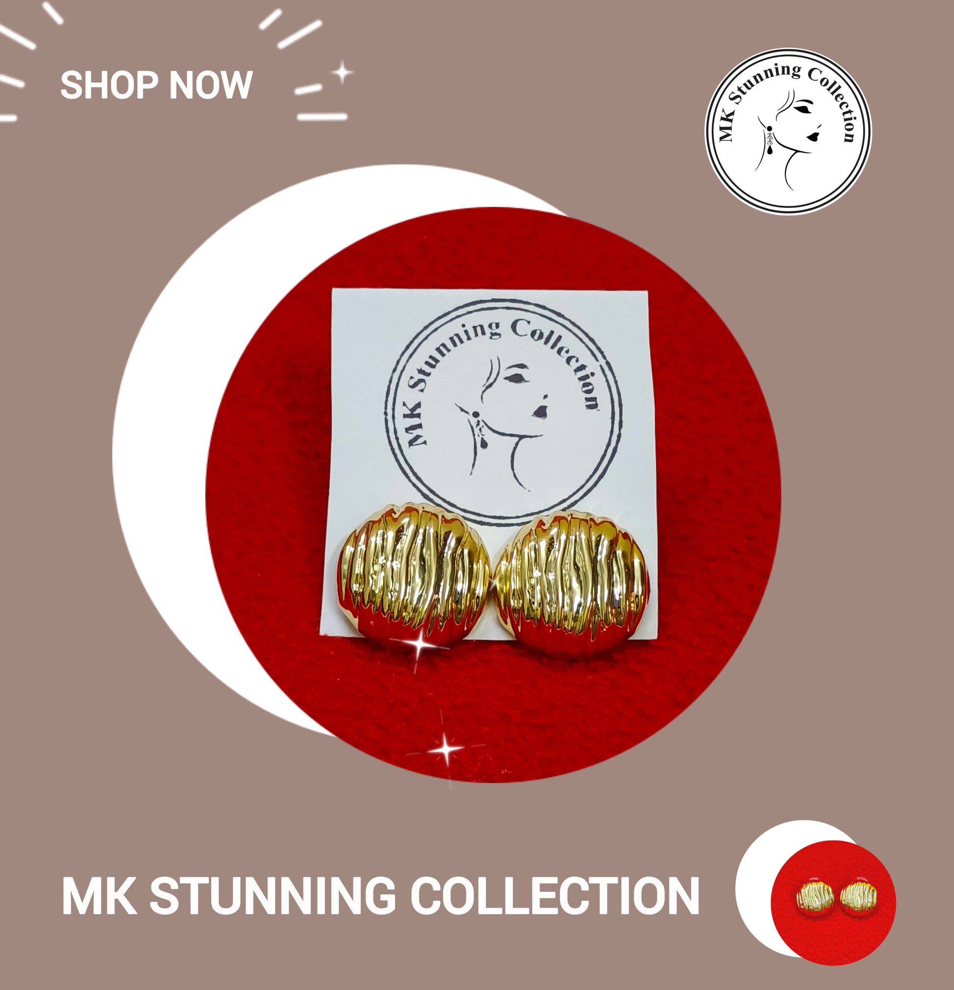 A pair of round, gold-toned stud earrings featuring a unique textured, wave-like design. The shiny surface catches the light beautifully, adding a touch of sophistication and modern style. Displayed on a vibrant red fabric background, these earrings are perfect for both casual and formal occasions.