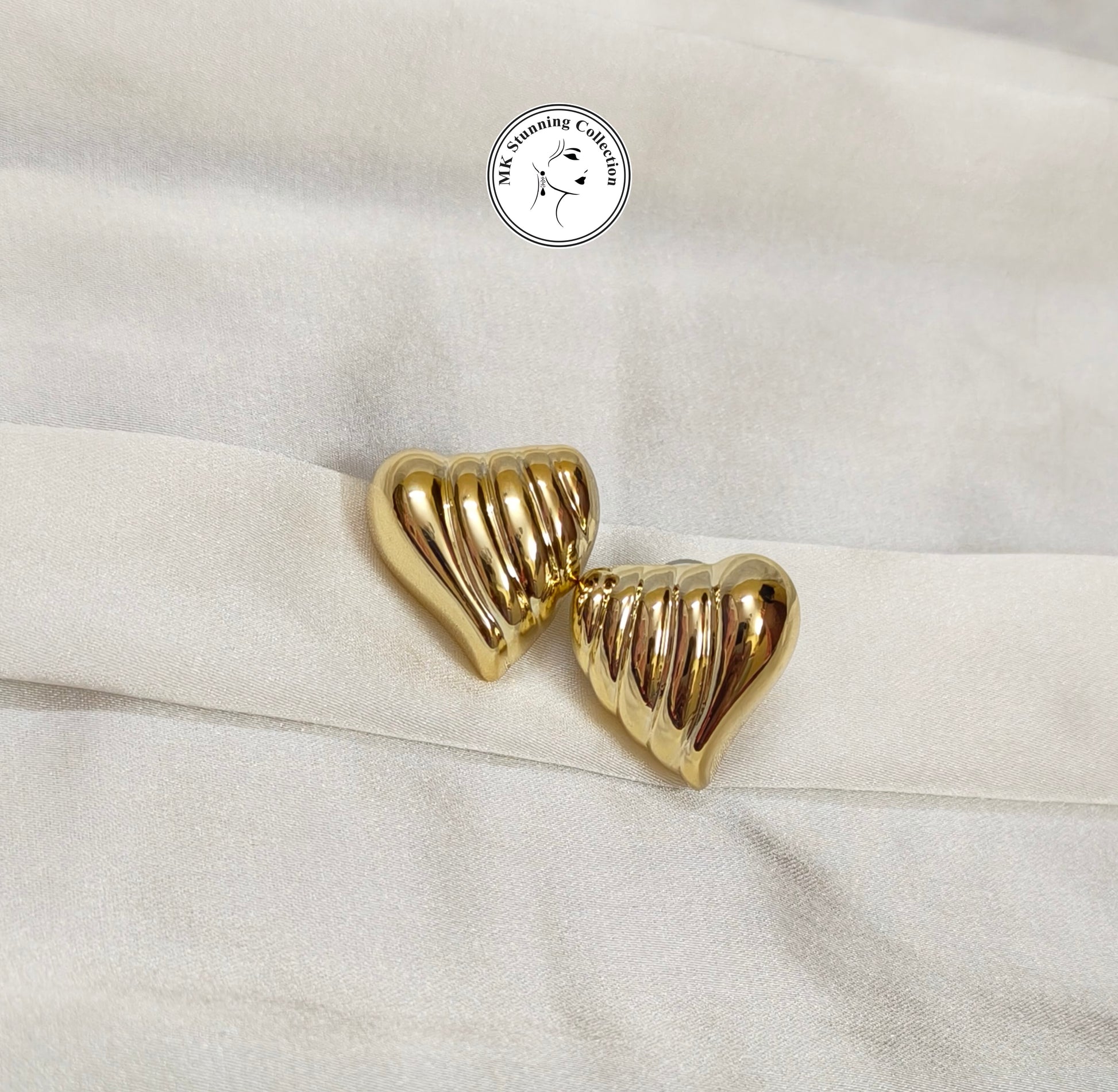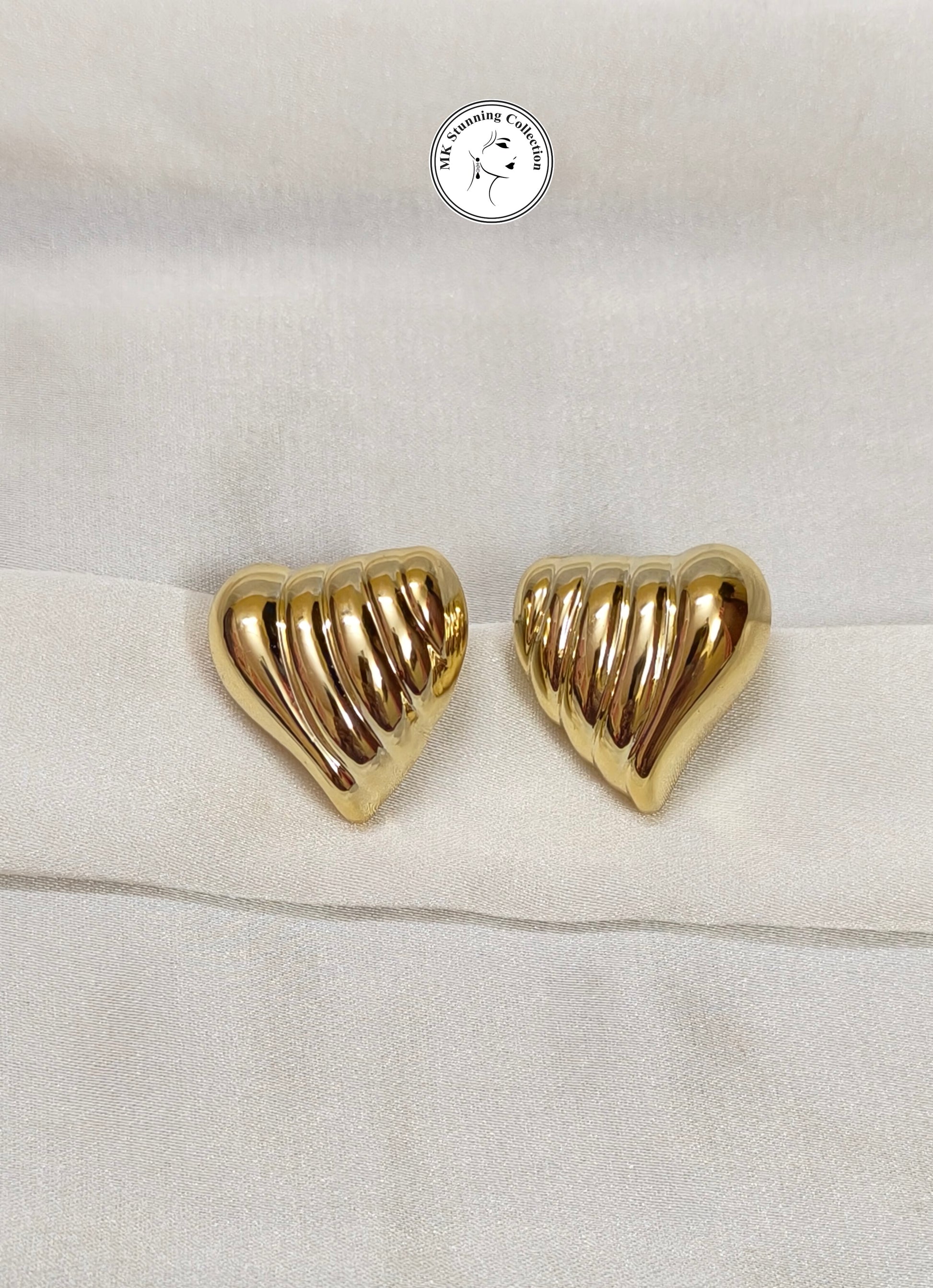 A pair of intricately designed, ribbed golden earrings rest gracefully atop rich burgundy fabric. The polished metallic surface reflects the light, accentuating the soft curves and modern sculptural form. The deep crimson backdrop contrasts the warm luster of the gold, creating an elegant and luxurious visual harmony.